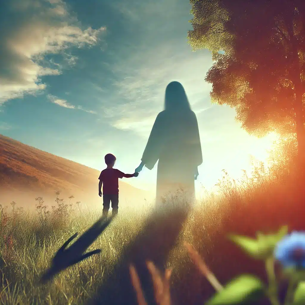 Egy magányos ember sétál a naplemente felé egy zöld mezőn, miközben madarak repülnek a távoli nap irányába. A nap sugarai áttörik a felhőket, és aranyló fénybe borítják a tájat.