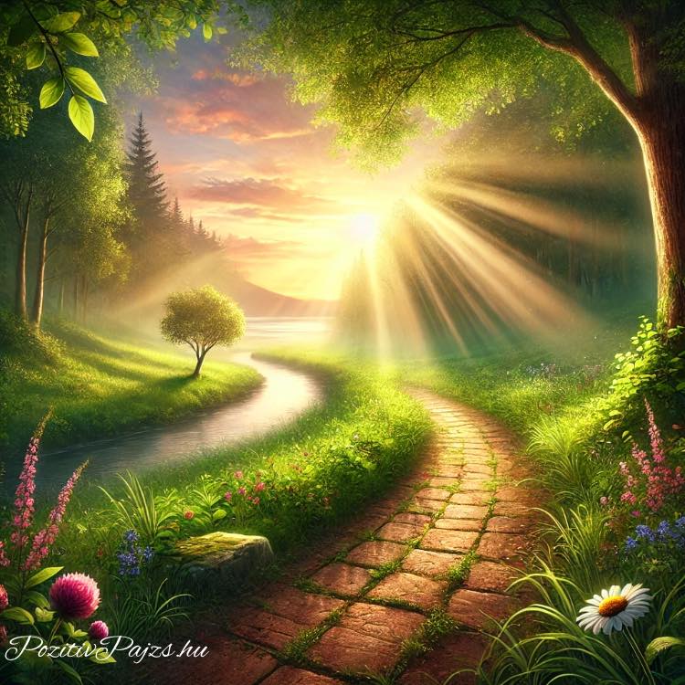 Egy magányos ember sétál a naplemente felé egy zöld mezőn, miközben madarak repülnek a távoli nap irányába. A nap sugarai áttörik a felhőket, és aranyló fénybe borítják a tájat.