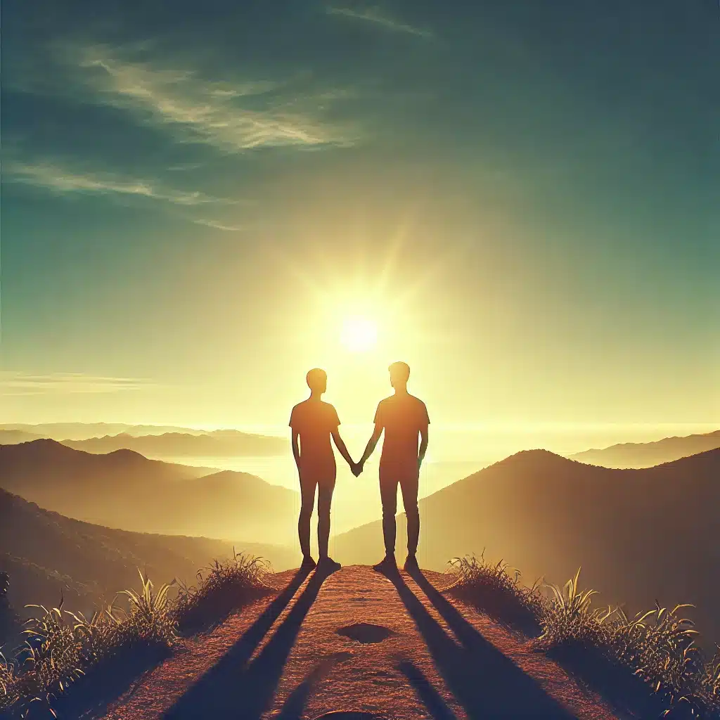 Fényes jelenet, ahol egy férfi vigasztal egy gyermeket, körülvéve szeretetteljes emberekkel. A középpontban a könyörület és az egymás iránti gondoskodás látható.