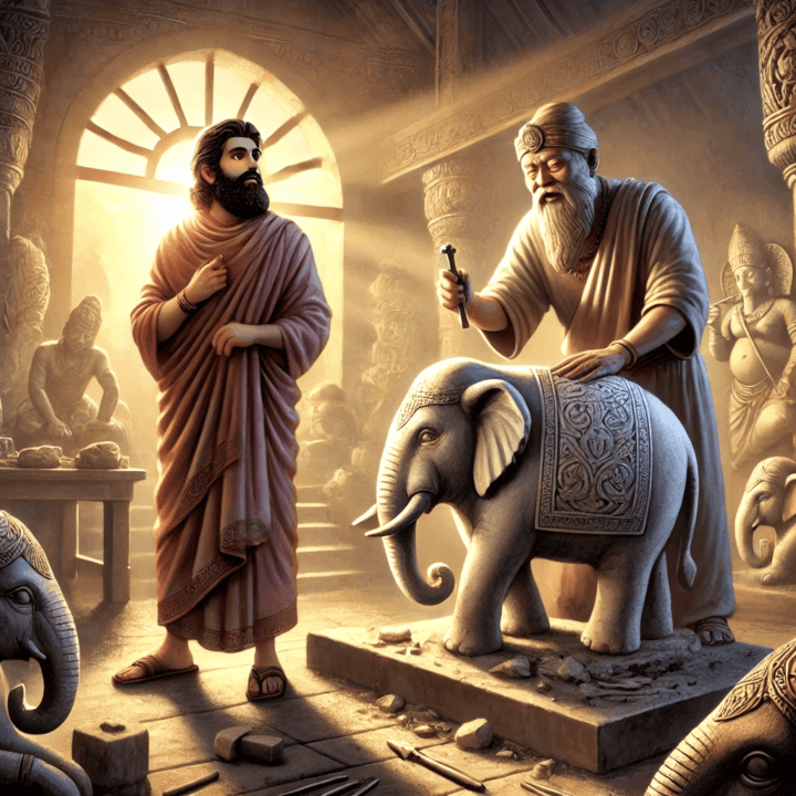 Élt egyszer egy király, aki nagyon szerette a művészeteket, és minden lehetősége szerint támogatta is azokat. Udvari szobrásza egy nap faragott egy csodálatos kőelefántot, amelyet az egész birodalom csodálattal szemlélt. A király is elámult a látványtól. Olyan olthatatlan vágy ébredt benne, hogy ő is meg akarta tanulni a kőfaragás gyönyörű mesterségét.