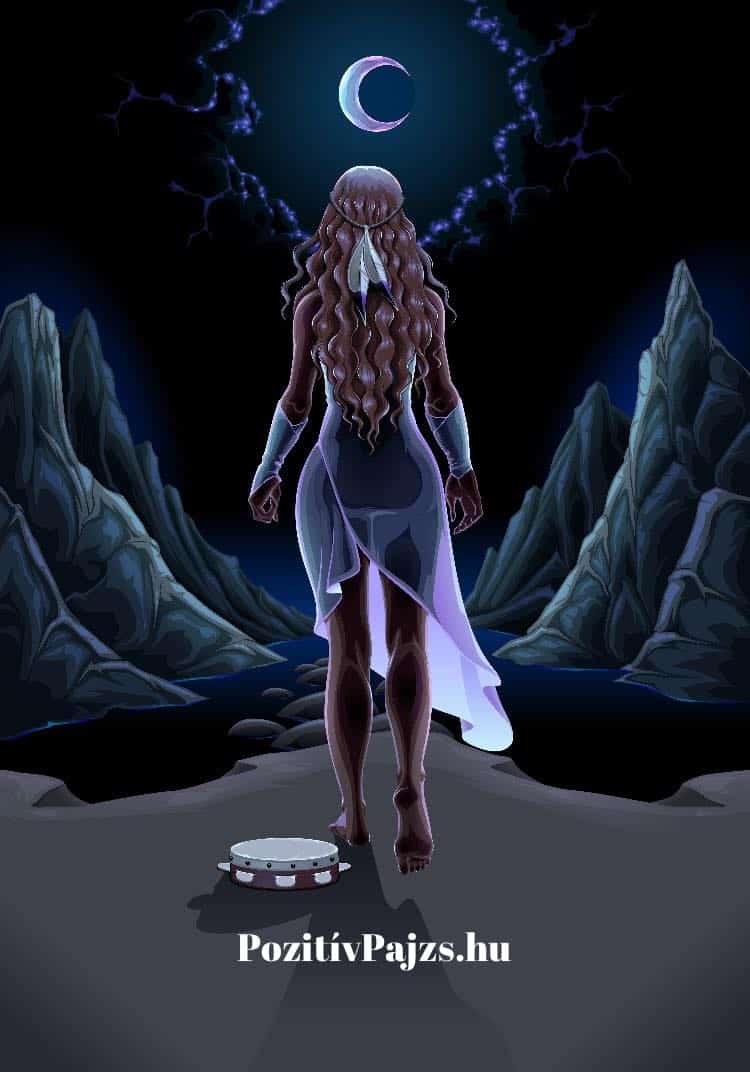 Egy magányos alak áll a hegycsúcson, és a nap fényébe mered, míg az égen több arcmás lebeg, mint egy szellemi vezetők jelenléte.